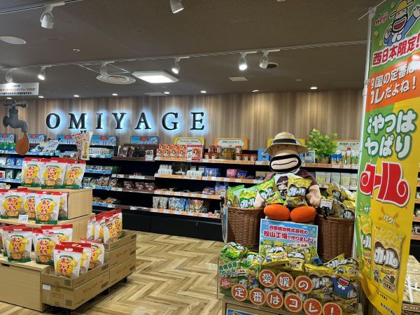 利用客は、地元の方だけでなく国内外の観光客の方も目立ちます。そのためお土産コーナーも品揃えが豊富で、愛媛のお土産品はもちろん、海外の方に合わせた商品も。韓国の方に人気があるという「こんにゃくゼリー」や「チューブのわさび」なども並んでたりするんですよ。見るのも楽しいコーナーです。
