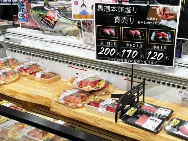 「どうしたら、旬のお魚を美味しく食べてもらえるか」と、日々試行錯誤されているのだそう。お二人のご経験と技が合わさって作られる、ここでしか買えない「お寿司」や「盛り合わせ」。ただ、なかなか買えないレアものですので、これは売場に行かないと!
