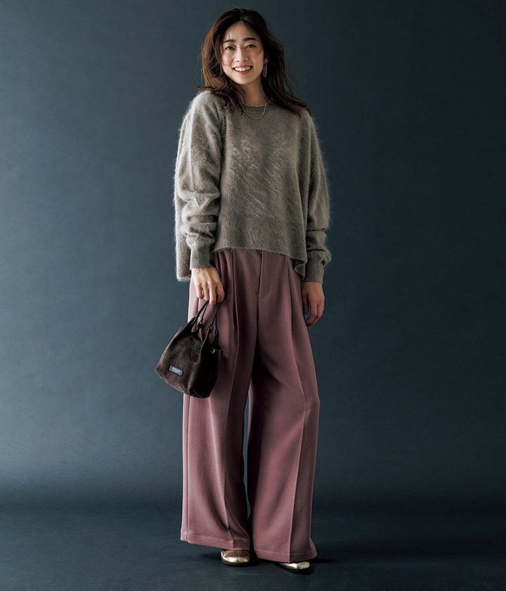<左>ニット¥18,700ストール¥14,300(ともにセピエ/コラージュ ガリャルダガランテ 京王百貨店 新宿店)パンツ¥20,900(アルページュストーリー)バッグ¥39,600(ロリステッラ/デ・プレ)パンプス¥64,900(ネブローニ)ピアス¥31,900リング¥35,200(ともにブランイリス/ブランイリス トーキョー)