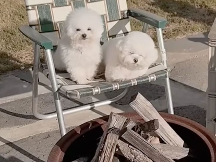 3. 日なたでほかほか♪ 焚き火を見守るふわふわ犬コンビ