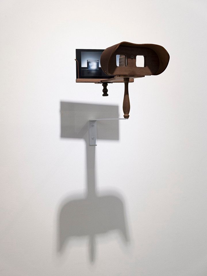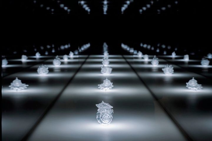 上下とも、《昨日の空を思い出す》(2022-)。MAHO KUBOTA GALLERYで行われた小笠原美環との二人展「同じ空の下に」(2025)より。3Dプリンタで再現した空をグラスの中に封じ込めたアーカイバルな作品を、ステレオスコープによる立体作品とともに発表。 Photo: HAYATO WAKABAYASH. ©AKI INOMATA, COURTESY OF MAHO KUBOTA GALLERY