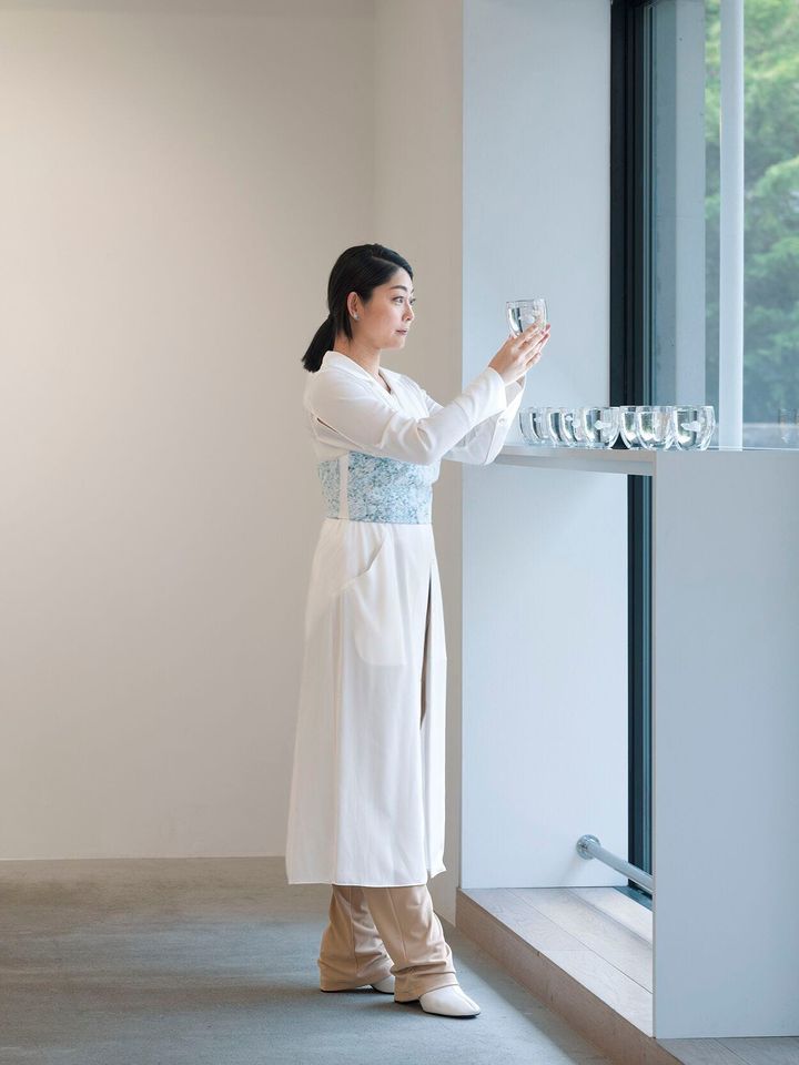 MAHO KUBOTA GALLERYで行われた小笠原美環との二人展「同じ空の下に」(2025)にて、AKI INOMATA。ビスチェ ¥26,400、パンツ ¥29,700(AKI INOMATA着用)<strong> Hatra</strong> Photo: Go Itami. HAIR&MAKEUP: TOMOKI TERUYA (GEM). STYLING: MARURI KAWAKAMI