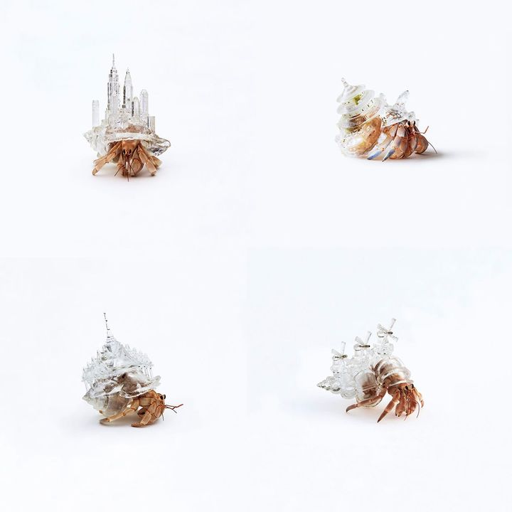 国境がいとも簡単に変わってしまうことに着想を得て、INOMATAは世界の都市のランドマーク的な建物を模した「やど」を3Dプリンタで作り、ヤドカリたちに手渡した。当然だが、ヤドカリは成長に合わせて貝を取り換える。