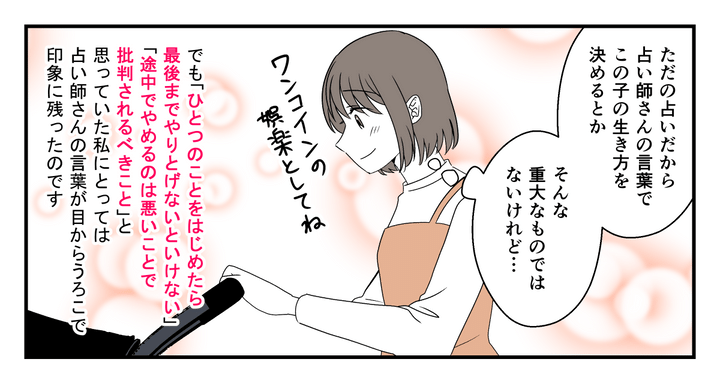 「ひとつのことをはじめたら、最後までやりとげないといけない」、「途中でやめるのは悪いことで批判されるべきこと」と思っていた私にとっては、占い師さんの言葉が目からうろこで、印象に残ったのです。