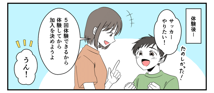 ある日、マサが嬉しそうに「同じ学年の友だちに、サッカーチームの人数が足りないから一緒にやろうって誘われたんだ」と話してくれました。私はその話を聞いて、「そうなんだ。それなら、まずは体験に行ってみる?」と声をかけました。
