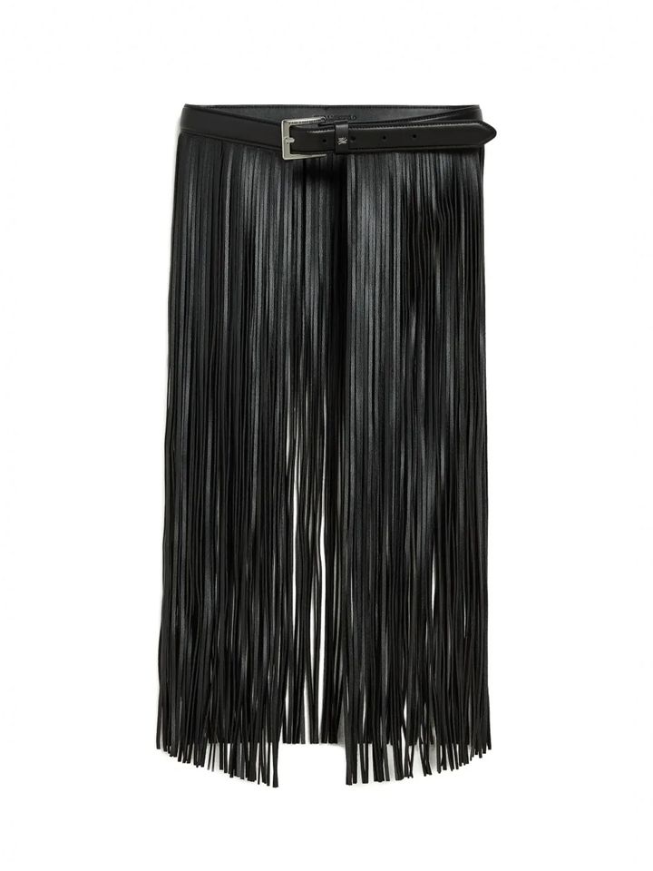 ホダコヴァ 2025-26年秋冬コレクション。タイトスカートから無数のベルトが飛び出した、まるでフリンジのような遊び心が楽しい。