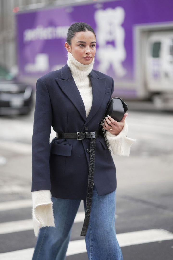 定番の黒ベルトは必ず押さえておきたい。テーラードジャケットの上に巻くだけで、エフォートレスな着こなしがグッと引き立つ。長めのデザインで表情を加えたり、ゴールドのバックルで華やかに見せるのがおすすめ。