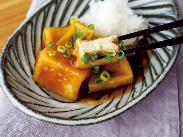 いつもの〈揚げだし豆腐〉とはひと味違う、滋味深いおいしさ。高野豆腐ならではのしみしみ感とむちっとした食感に、思わずほっとするはず。ぜひ試してみてくださいね。