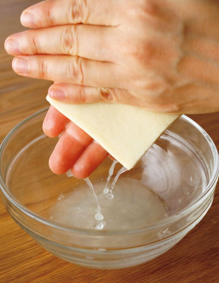 バットやボールに高野豆腐を入れ、50℃ほどの湯をひたひたに注ぐ。5分ほどおき、手でさわって中まで柔らかくなっていたら、両手でぎゅっとはさみ、水けを絞る。
