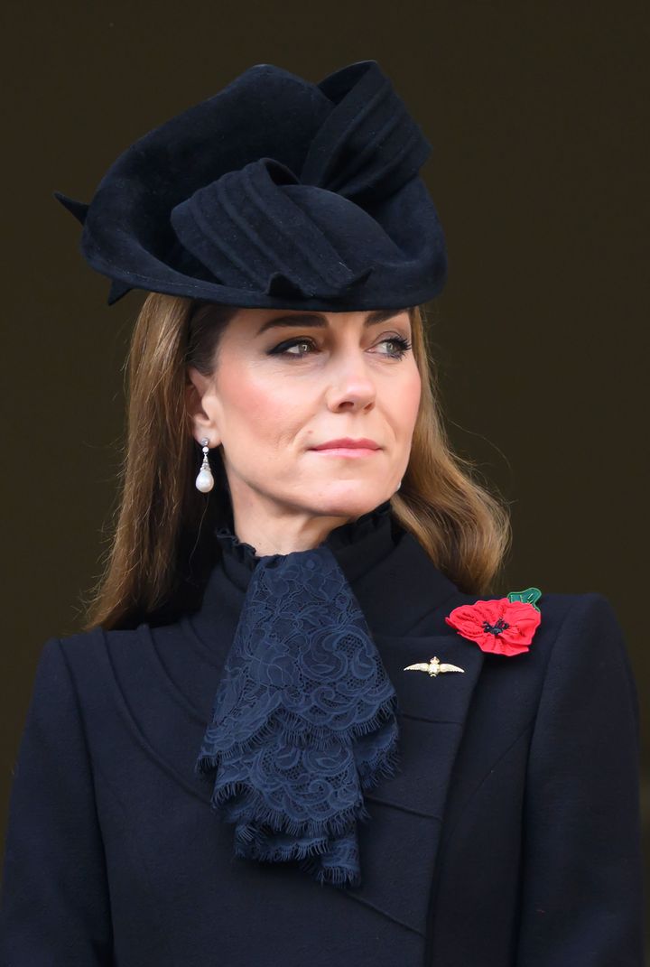 キャサリン・ウォーカーによるこのテーラードコートは、構築的なショルダーラインと斜めのピンタックが特徴的。中にはレースのタイが覗くネイビーブルーのブラウスを重ね、胸もとには追悼の象徴である赤いポピーの花を飾った。イヤリングは義母ダイアナ元妃が所有していたパールドロップのイヤリングで、代々受け継がれる王室の宝を身につけていた。仕上げには、ロック・アンド・コーによるスタイリッシュなファシネーター(ハット)を被り、柔らかなウェーブヘアを合わせていた。