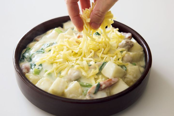 (3)耐熱の器に(2)を広げ入れ、ピザ用チーズを散らす。オーブントースター(1000W)で、チーズが溶けて焼き色がつくまで5分ほど焼く。