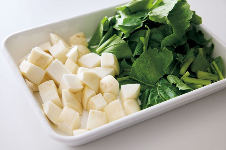(1)かぶは葉と身を切り分ける。身はよく洗い、皮つきのまま2cm角に切る。葉は長さ3cmに切る。マッシュルームは石づきを切り、縦半分に切る。ソーセージは斜めに3等分に切る。