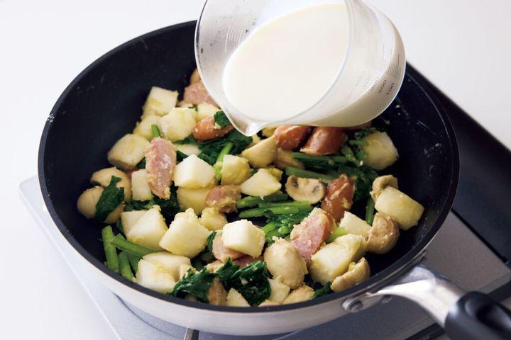 (2)フライパンにバターを入れて中火で熱し、(1)を入れて3分ほど炒め、小麦粉をふり入れてさらに炒める。粉っぽさがなくなったら牛乳を少しずつ加えてそのつど混ぜ、全体にとろみがついたら塩を加えて混ぜ、火を止める。