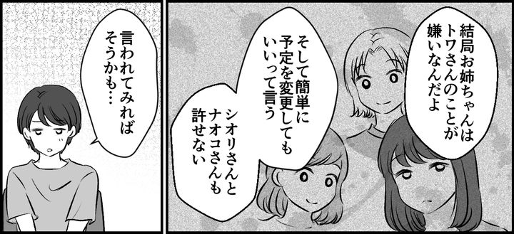 そして「お姉ちゃんはトワさんが嫌いで、今回が関係に終止符を打つ決定打になっただけ」「そんな集まりは抜けたほうがいい」と言われました。