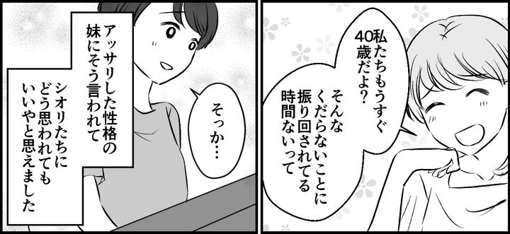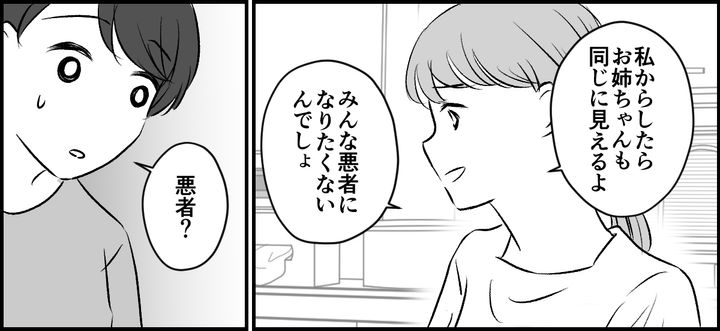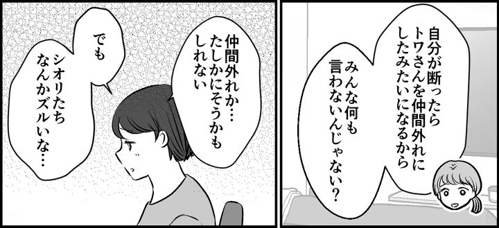 翌日、たまたま妹が家に来たので、トワの件を話しました。妹も進学を機に上京して結婚したため、わりとうちの近くに住んでいるのです。「シオリさんとナオコさんもお姉ちゃんと同じような気持ちではあると思うけどな」と妹は言いますが、客観的に見ると、私も他の2人と同じようなものだと言われました。悪者になりたくない人たちだなと思うそうです。