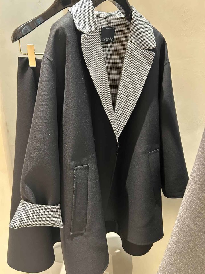 最近の暖冬傾向もあり“ジャケット以上コート未満”の軽アウターが「秋から春先まで長く着られて、実はいちばん出番が多いのかも!」と思うように。立体的なシルエットが綺麗なので、寒い日はジレやニットを重ねてもバランス良く決まりそうです。バイカラー配色の千鳥格子柄は、シンプルなコーデに羽織るだけで一味違うオシャレ感が期待できます。