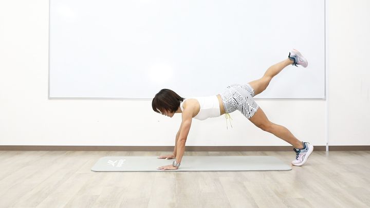 両手と片足で体を支えた状態から、片脚を浮かせます。浮かせた脚のひざを引きつけながら背中も丸め、その後また脚を伸ばします。