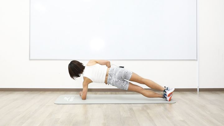 伸ばした状態の両腕とつま先で体を支え、そこから左右交互に肘の曲げ伸ばしを行います。バランスが崩れないよう、注意してください。