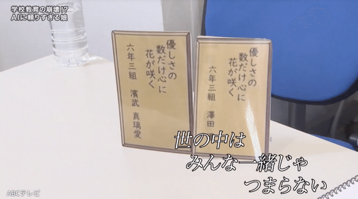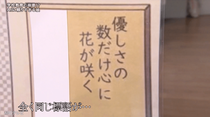人権標語は次女だけでなく、当時の6年生の中から7人が表彰されていた。表彰された7つの標語を見比べて、「うわああああああ〜!」と叫び声を上げる真栄田探偵。なんと、次女が提出した「優しさの 数だけ心に 花が咲く」と全く同じ標語が選ばれている! 理解が追いつかない探偵が、「それは審査員おかしいだろ!」とカメラ越しに訴える。他のいくつかの標語からも、漂う怪しいAI臭。そこで探偵は、「この中で一体何人がAIを使っているのか」という真相を知るために、表彰されたメンバーを招集する。