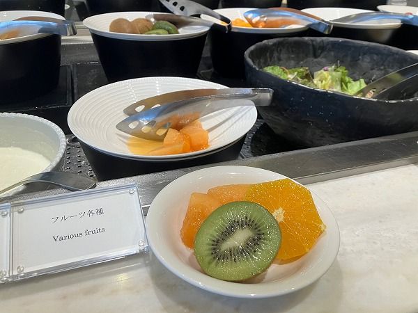 個人的に魅力を感じたものの一つが、フルーツコーナー。フレッシュな果物が大きめカットで用意されています。キウイは、丸ごと1つを半分にカットした大ぶりサイズ。サイズ感が贅沢で満足度が高かったです。