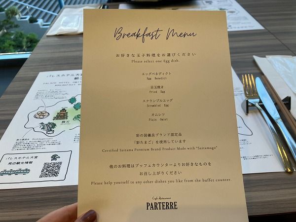 まず席に着いたら、メイン料理の玉子料理を注文。卵は埼玉県産ブランド卵「彩たまご」、調理法はエッグベネディクト、オムレツ、スクランブルエッグ、フライドエッグの4種から選ぶことができます。