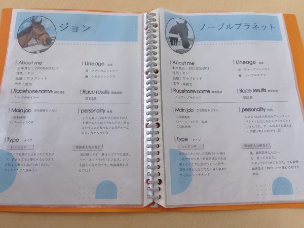 この日騎乗する馬は写真左の「ジョン」君。 「真面目だけど、いつも眠くて授業中寝ちゃう系男子」だそう。かわいいっ♪