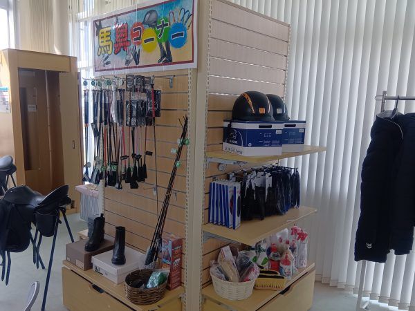 管理棟に入ると、会員の方や子ども連れのファミリーなどたくさん。馬具コーナーもありますね。かっこいい〜!