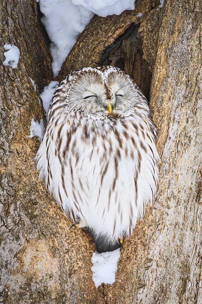 このエゾフクロウを初めて見た時は、あまりにも気持ちよさそうな顔で眠っているその姿、かわいさに私も思わずにやけてしまいました。