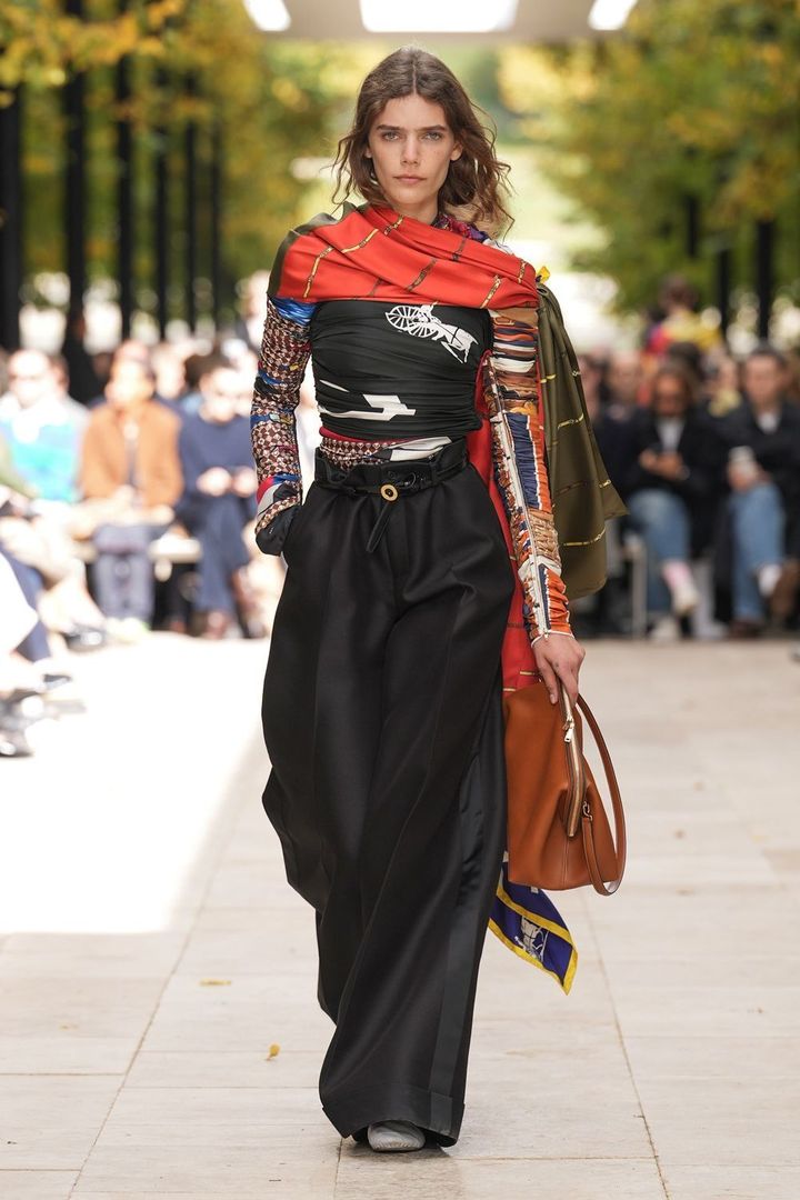 そのほか、ランウェイを彩ったネイビーのケープドレスや、鮮やかなカラーのシルクスカーフ、エナメルやシルクを使用したアクセサリーなど、ブランドの新たなエスプリを感じるアイテムが揃う。