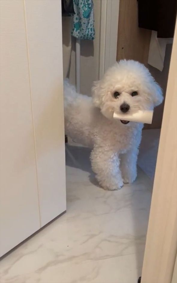 イタズラして飼い主さんを煽っている?トイレットペーパーの芯を奪ってその場を去ろうとするビションフリーゼ「なんか悪いことしてると思ってる感じですよね」