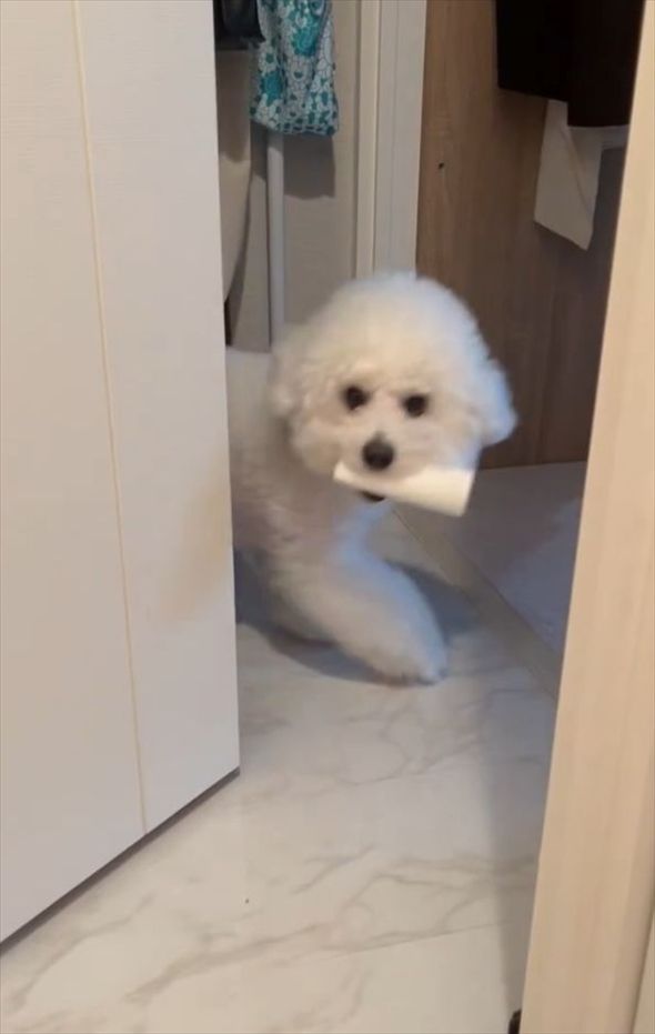 3. イタズラして飼い主さんを煽っている?トイレットペーパーの芯を奪ってその場を去ろうとするビションフリーゼ「なんか悪いことしてると思ってる感じですよね」