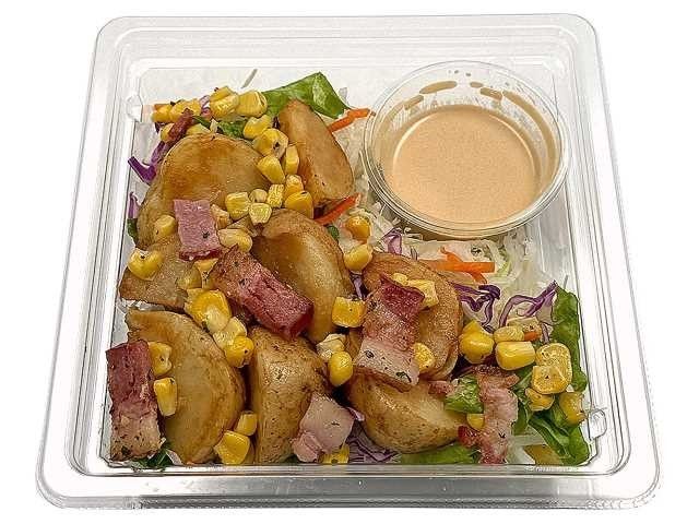 バター醤油たれを和えた北海道産のじゃがいもに相性の良いベーコンとコーンを組み合わせた、コクのあるピリ辛和風マヨネーズドレッシングで食べるおかずサラダです