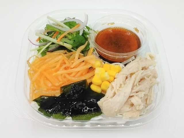蒸し鶏と彩りの良い野菜を盛り付け、ピリ辛ドレッシングで食べるラーメンサラダです。