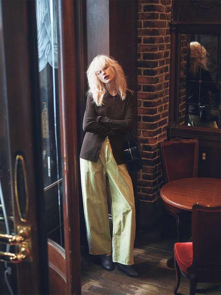 白のようなさわやかさにニュアンスを含ませられるミントグリーン。コーデュロイのぬくもりと合わせることで、大人らしい深みとともにパステルカラーをとり入れられる。シルエットのアタリや色みの濃淡など風合いや染色にこだわり、淡い色でも間のびしない表情豊かに着られる仕上げ。