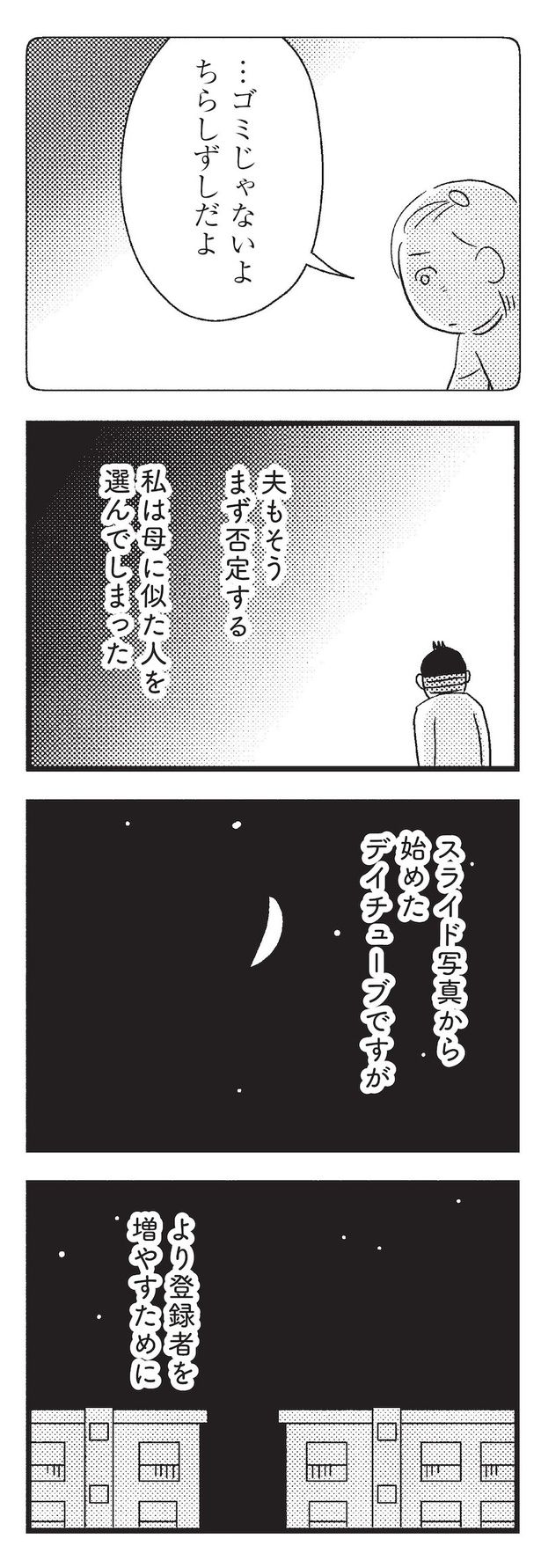 デイチューブは私たちが自由になるための唯一の方法だった――。職場でも家庭でも頑張りが認められず、自分に自信が持てずにいた主婦・山田あずさ。ある日始めた「デイチューブ」の動画配信で、自分の料理が認められ、少しずつ配信活動にのめり込んでいく。娘を出演させた動画の評価が高く、登録者数も増加することに気づいたあずさは、自分をないがしろにする夫と別れ、自立するためにも、ついには娘の顔出しまで考えるようになり――。動画配信によって歪んだ親子の関係性を描くセミフィクション『子どもをネットにさらすのは罪ですか?』を好評につき再連載いたします。