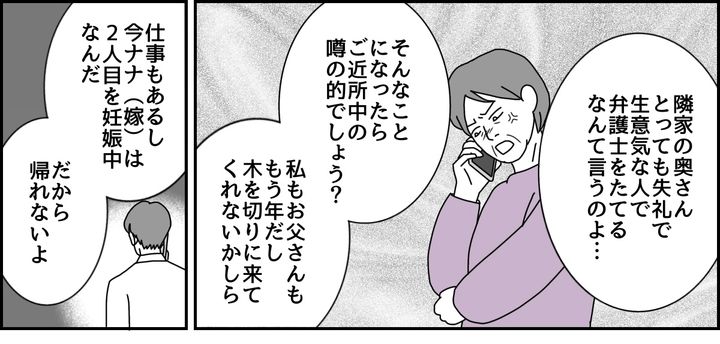 私はユミコ(60代後半)。夫は70代後半で、昔のようにDIYをすることができなくなりました。もちろん、私もお掃除をするのがやっと。先日、隣家のジュンさん家族に、庭の木の枝が家の方に飛び出しているから、その部分を切ってほしいと言われました。そのことがきっかけで、前々からの不満が爆発してしまい、ジュンさんと言い争ってしまうことに。結局「切らないなら弁護士をたてる」と言われ、暴言まではかれたのです。だから、息子・タカシ(30代)に相談をしたのですが……。