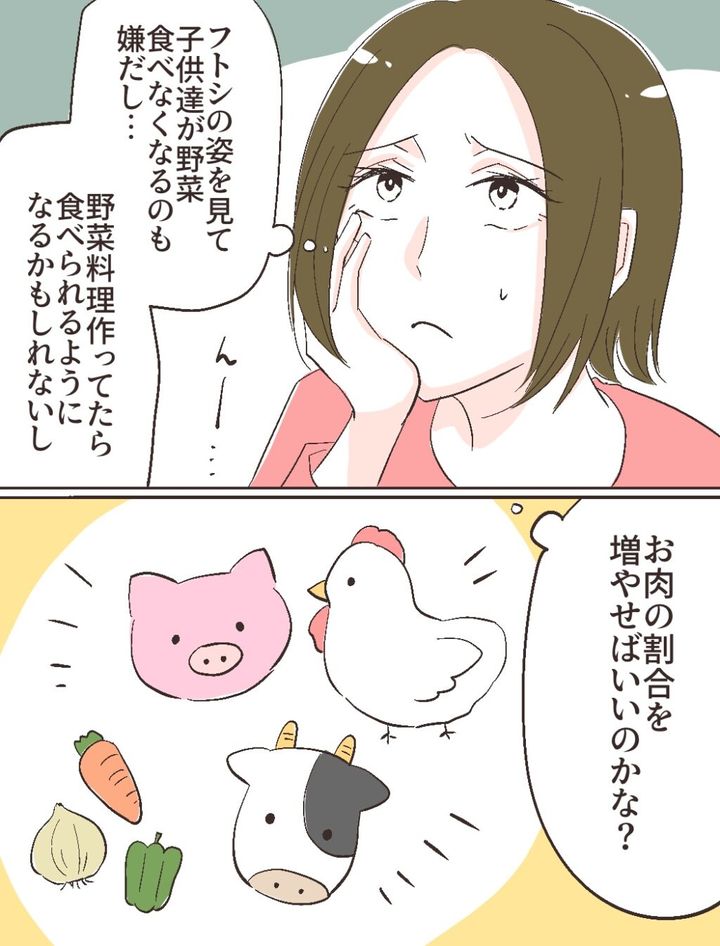 フトシの姿を見て、ユウヤやサラが野菜を食べなくなったらイヤですし、野菜料理に慣れていけば、少しずつでも食べられるようになるかもしれない。そう考えているうちに、お肉の割合を増やした野菜料理を出してみたらどうかな、と私は思いつきました。