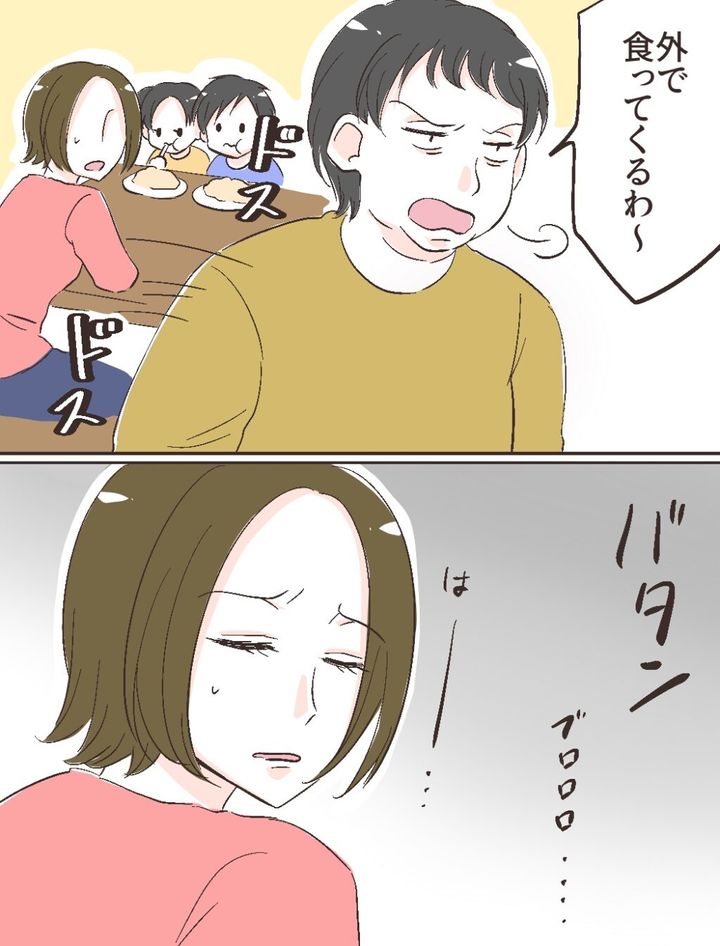 明日からの食事のことを考えていると、フトシがまだイライラしたまま「外で食ってくるわ~」と食事中の私たちに言い捨てて出かけていきました。苦手な野菜が食卓に出たからと言って家族との食事を拒否して外食に出かけるフトシにもう何も言わず、私はただ大きなため息をつきました。