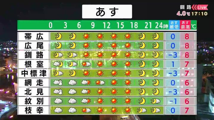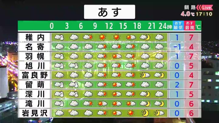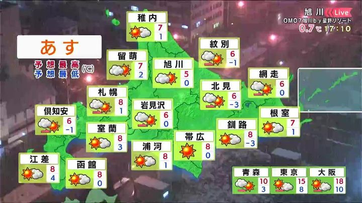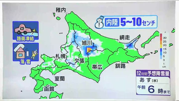 旭川や留萌、深川の雪は朝にはやみ、日中は日が差す見込みです。最高気温は5度くらいです。大雪になった地域では、屋根からの落雪や泥はねにも気を付けて下さい。