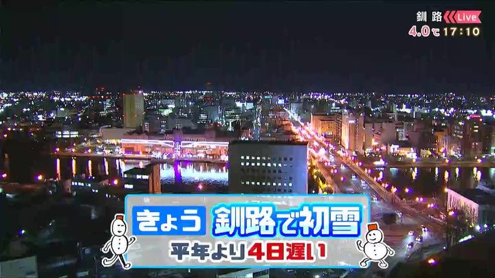 ただ、日中は強い風の影響で雪雲の一部が山を越えて釧路まで流れ込みました。釧路地方気象台で初雪の観測です。平年より4日遅い観測でした。