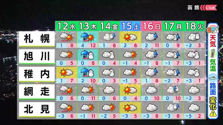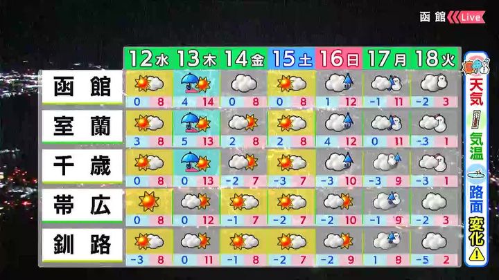 木曜は西部で雨が降りますが、気温は10度を超え、函館は14度でしょう。金曜、土曜は晴れても寒く、日曜の雨の後、来週は道南方面でも雪の積もるおそれがあります。