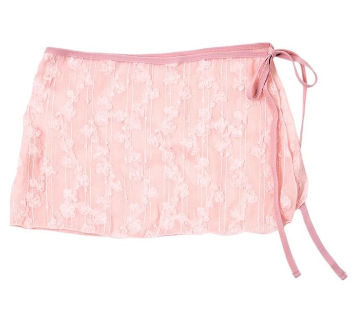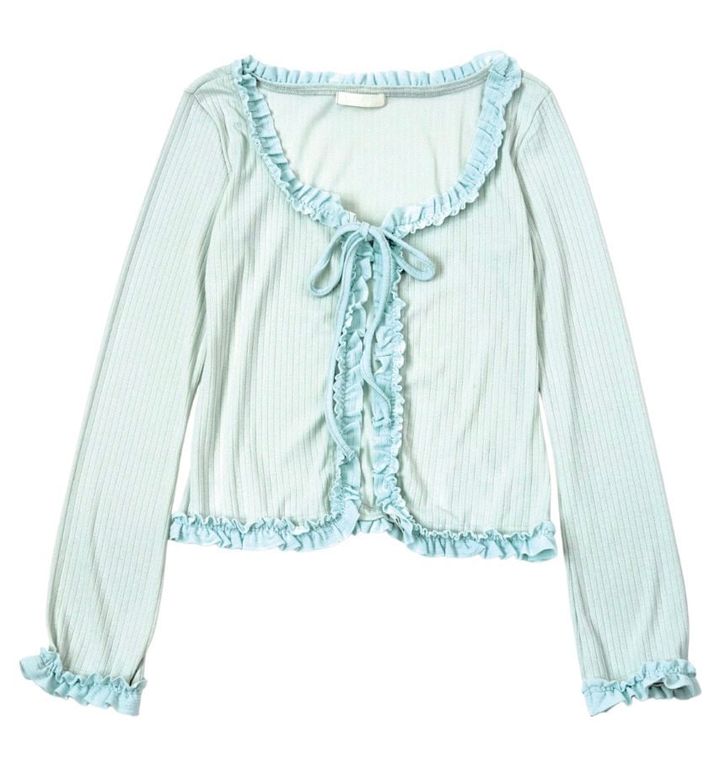 【上から】レイヤードコーデにぴったりのシースルー素材。ゆめかわなベイビーピンクに胸が高鳴る♡ ラップスカート¥8,140、淡いミントグリーン×フリル×リボンの激可愛タッグ。カーディガン¥9,350/ともにアスラ(ハナ コリア)