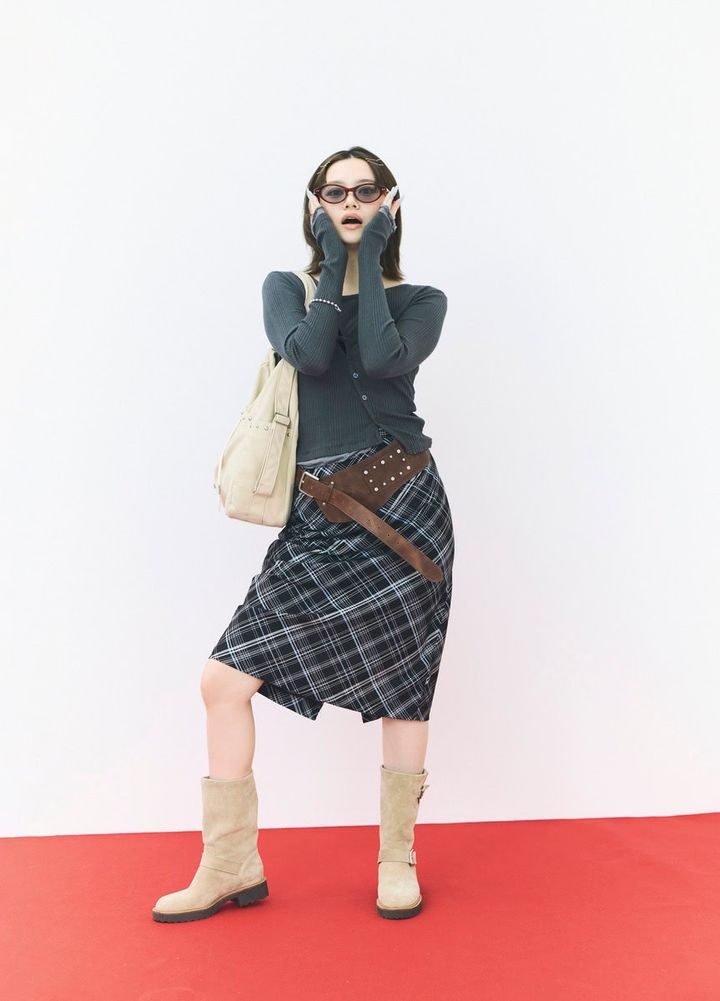 トップス¥10,230、スカート¥11,660、ベルト¥12,980、バッグ¥20,130/以上すべてアスラ(ハナ コリア)、サングラス¥5,900/RIM(JINSカスタマーサポートセンター)、ブレスレット¥31,900/ラムダ、ブーツ¥25,300/ル タロン(ル タロン有楽町マルイ店)