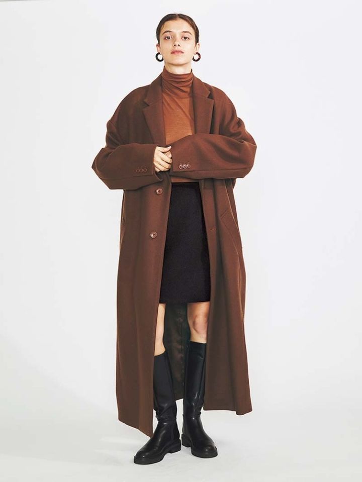 ともすると幼いミニを大人っぽく見せる肉厚な黒のウール素材。ヒザ下より長いロングコートと、軽快なミニが好相性。足首までの長め丈がスカッとしないよう、ロングブーツで重みを。