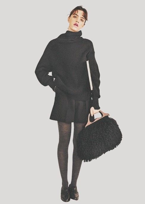 トップスはビッグシルエットを軸に、オール黒でまとめるのがミニを甘く見せない正攻法。リラックスして見えつつも、バランス良く仕上がる「上はゆるく・下は短く」の組み合わせを軸にタイツでつなぎ、肌をいっさい見せないことで、ミニ丈も大人っぽく。ボトム丈が短くなれば、上から羽織る重めなコートとのバランスも良化。