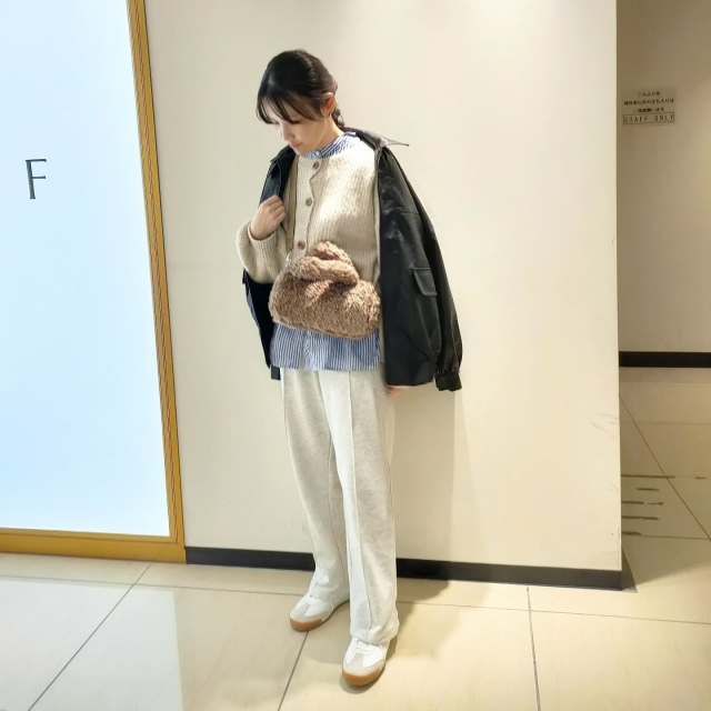 ガツンとした雰囲気のレザーブルゾンにハマるのが「ストライプ柄シャツ&白スウェットパンツのコーデ」。爽やかなトップスとパンツの合わせ技でレザージャケットのインパクトが落ち着き、おしゃれなMIXコーデが楽しめますよ。