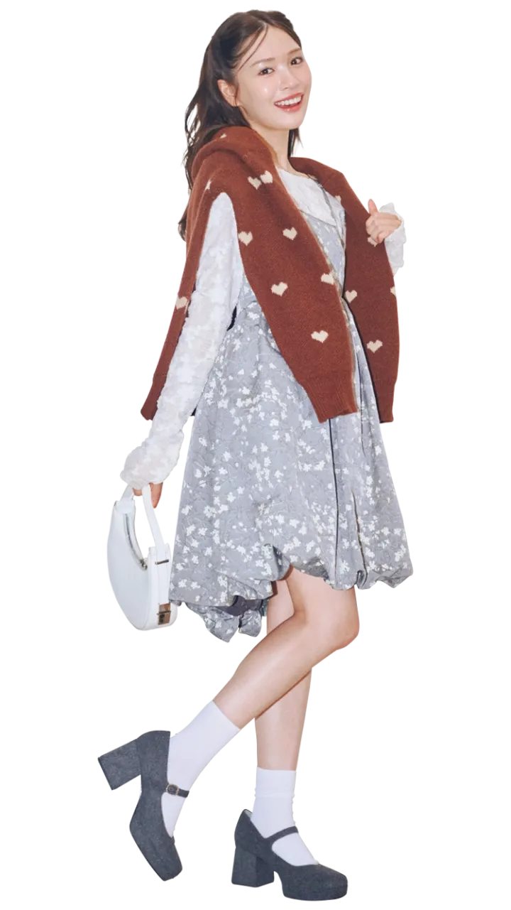 グレーの花柄ワンピに、ハート柄ニットを肩掛けして“可愛げ×きちんと”を両立。白ミニバッグで明るさを足して、写真映えも会話も弾むムードに♡