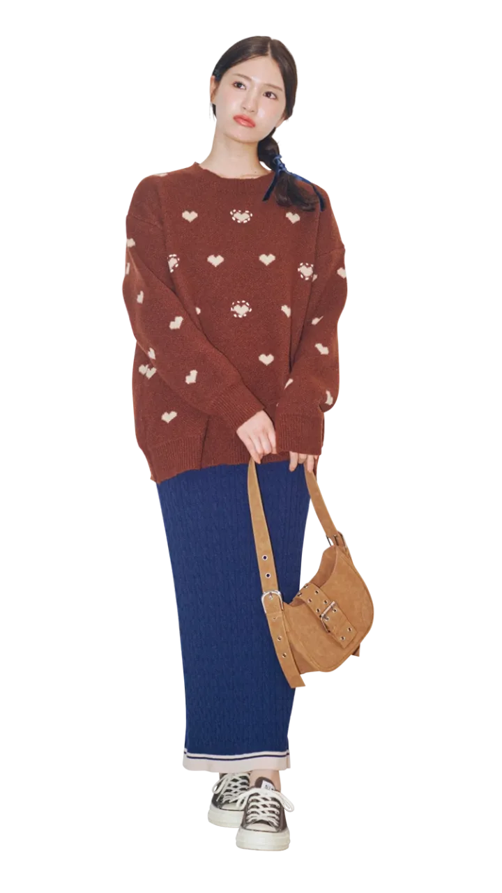 ハート柄ニットをざっくり、ネイビーのリブタイトで縦ライン強調。白スニーカーで軽さを出し、キャメルバッグでやわらかく。甘さは残しつつ、落ち着きもキープ♡
