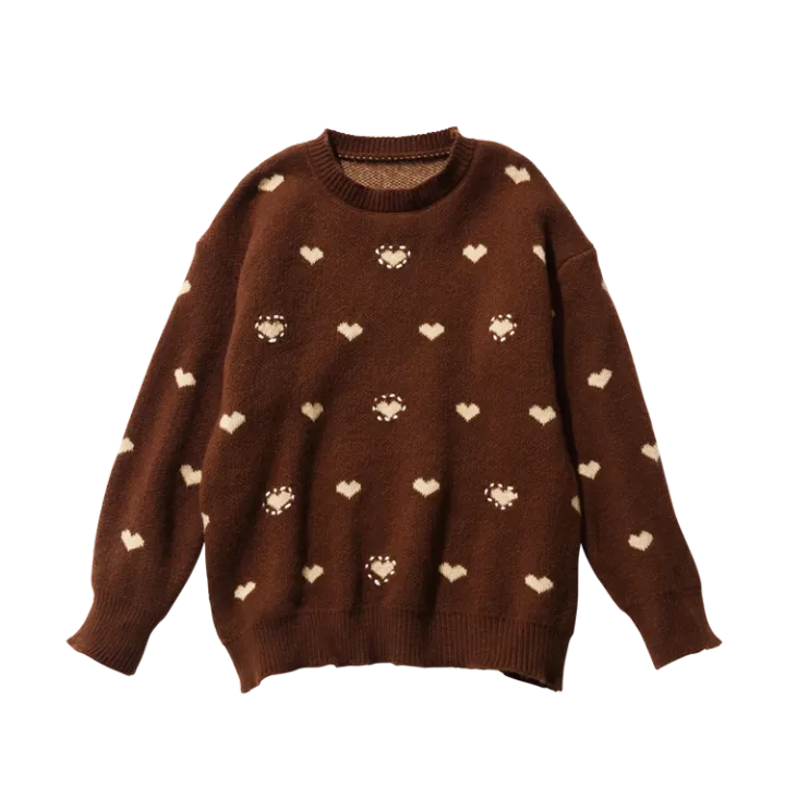 キュートなハート柄ニット。ガーリーなデザインも、ホワイトとブラウンの落ち着いた秋カラーなら、柄ボトムにもあわせやすい。
