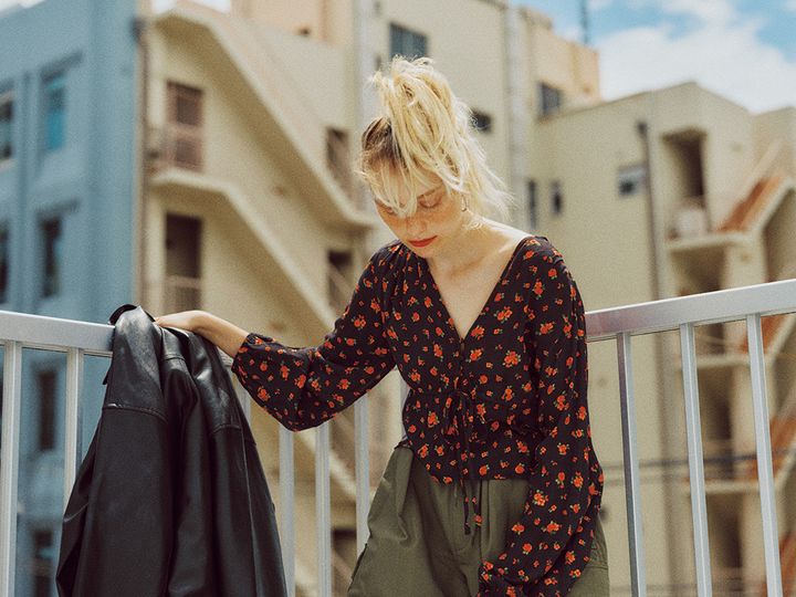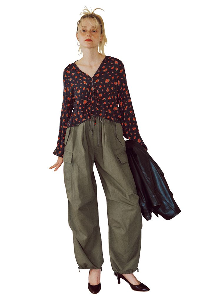 古着のようなノスタルジックな小花柄に、鎖骨がのぞくVネックがほのかな色気をプラス。ボーイッシュなカーキパンツとレザーブルゾンでスパイシーに盛り上げて。